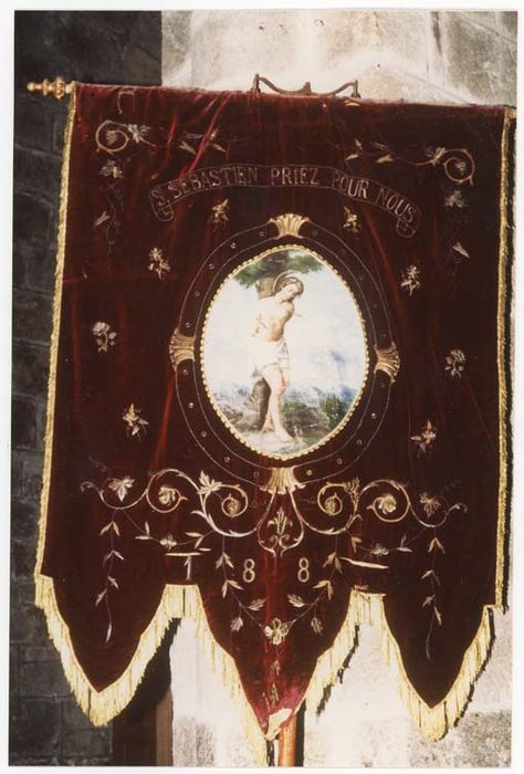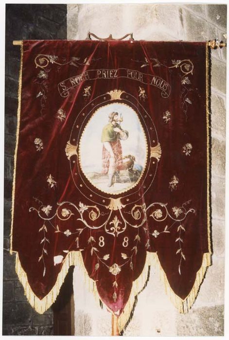 Bannière en velours rouge grenat brodé aux fils d'or de pampres de vignes et rinceaux. Elle présente sur les deux faces un médaillon peint sur une toile rapportée entouré d'un cadre au fil d'or rehaussé de cabochons en métal doré. Franges d'or en partie inférieure.