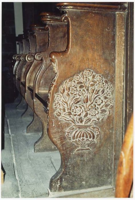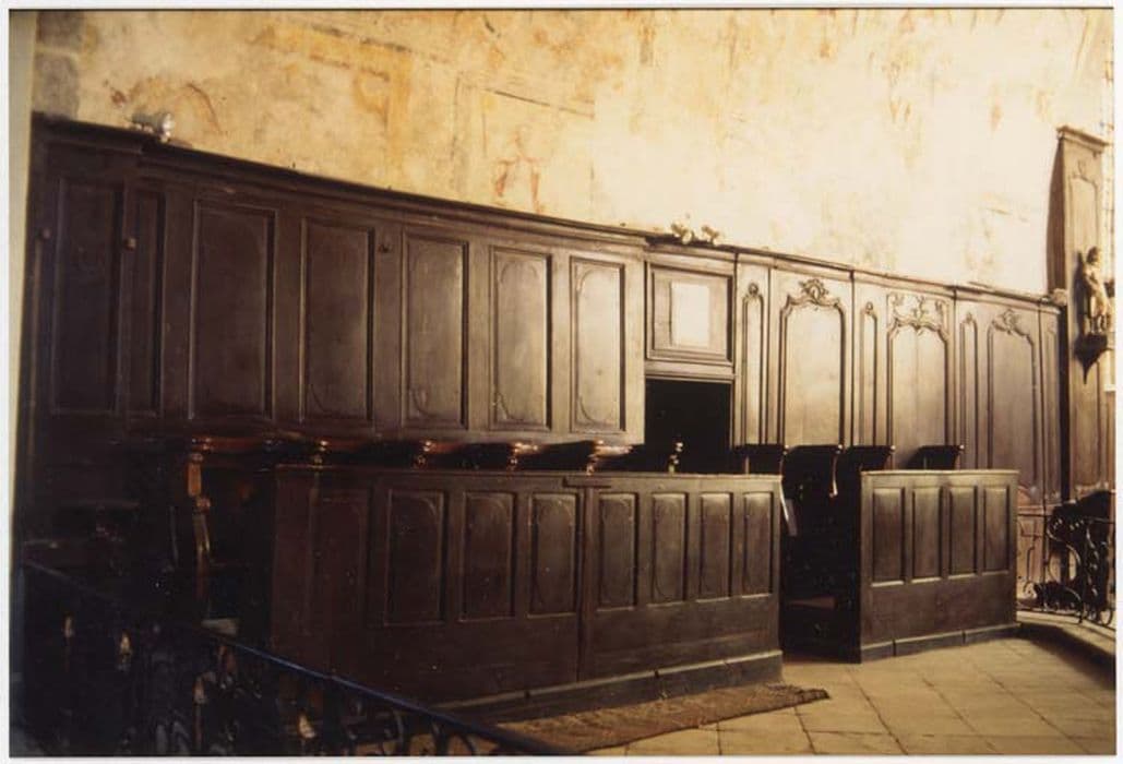 A l’avant du choeur : cinq stalles de part et d’autre en noyer. Les deux rangées différenciées par le profil des parcloses et la mouluration des museaux d’accoudoirs. Sur un côté de chaque rangée, jouée ornée de bouquets. Les prie-Dieu sont des panneaux de boiseries Louis XIII, répliques de ceux des lambris. De chaque côté du choeur, trois stalles en chêne.