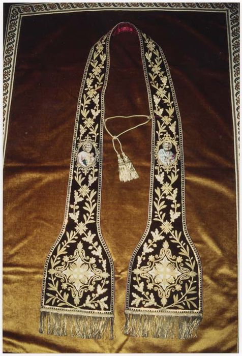 Fond de soie noire brodée de branches entrelacées or. En haut, brodées au fil de couleur, figures de saint Pierre et saint Paul dans une mandorle. En bas, crois or.