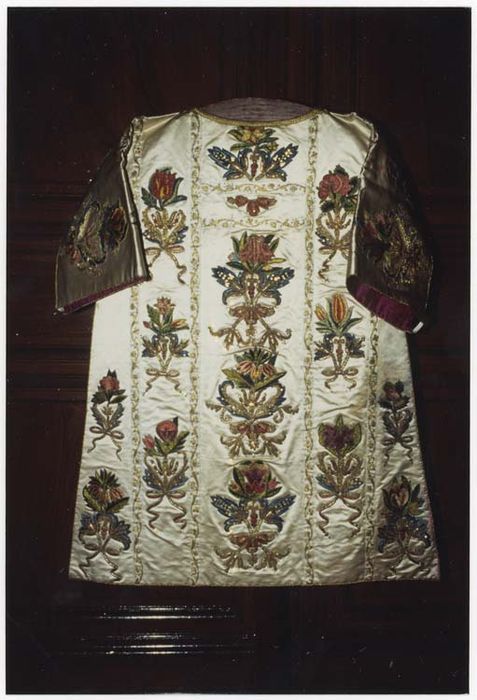 Broderies du 17e siècle sur une soie blanche du début du 20e siècle. Dalmatiques assorties à la chasuble PM42001596.