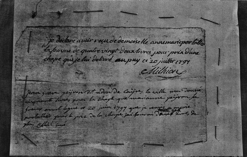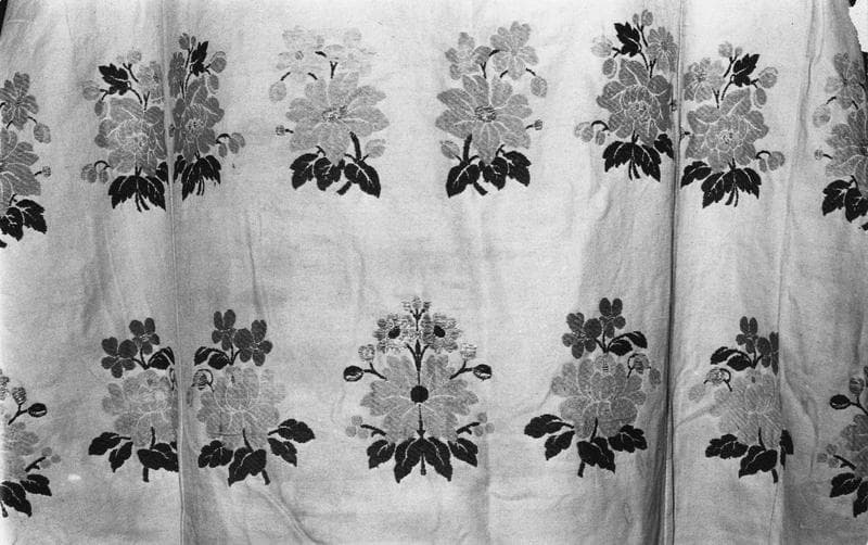Le dos de cette chape présente un fond de satin blanc, fait de soie et de coton, sur lequel se détachent des bouquets brochés de schappe, lamé d'or et filé d'argent riant. Le chaperon frangé d'argent et les deux bandes du devant ont, sur fond de satin rouge, une décoration brochée.