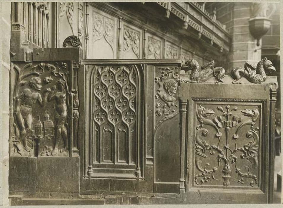 Description fiche objet de H. Nodel (octobre 1906) : "Les stalles se composent de 25 stalles de 2e rang abritées par un dais continu, la stalle centrale forme un motif du milieu plus riche avec jouées latérales sculptées et de 20 stalles de 1er rang séparées par 3 passages : les jouées de ces passages sont ornées de superbes panneaux. Malheureusement les jouées de la stalle de milieu ont perdu les 2 personnages qui les décoraient.