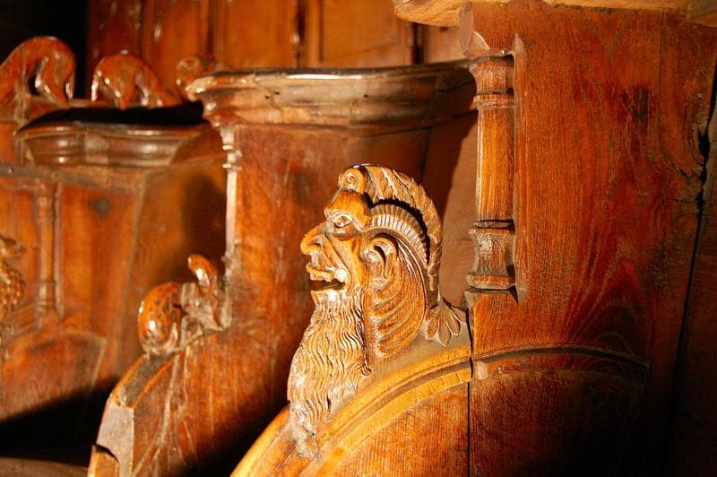 Ces stalles sont aussi datées : l'inscription est sculptée en relief sur un panneau au-dessus d'une stalle de 2e rang à gauche.