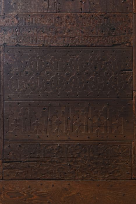 cèdre : taillé, décor en relief méplat ; pin : taillé, décor en relief méplat ; chêne : taillé, décor en relief méplat