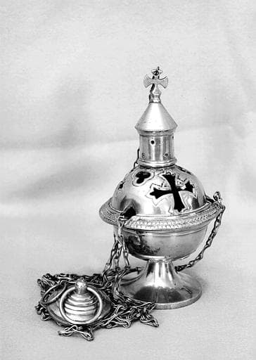 Coupe sur pied surmontée d'un couvercle semi-sphérique dont les perforations sont trilobées ou en croix pattée. Sur le couvercle un petit clocheton est couronné d'une croix servant d'anneau de préhension.