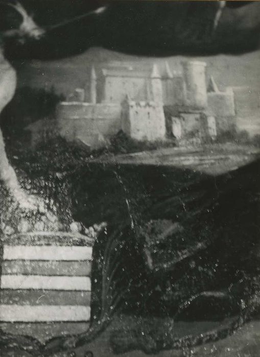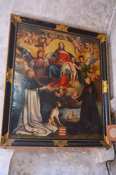 Vierge, rosaire, saint Dominique, saint Simon Stock ; représentation animalière (chien) ; vue d'architecture (Lavoute-sur-Loire : château)
