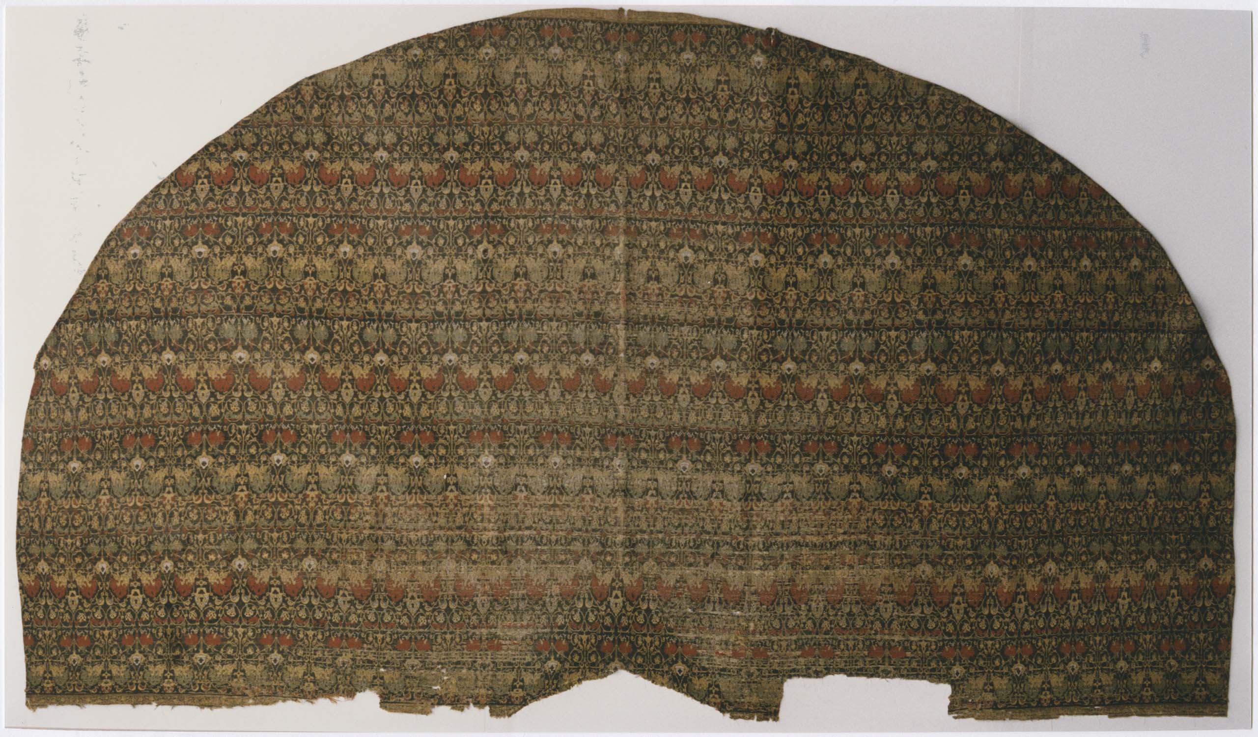 Décor disposé en bandes parallèles comprenant deux séries de sujets se combinant dans un ensemble harmonieux de tiges et de fleurs entrelacées. La première bande se compose de deux groupes affrontés de deux animaux dans lesquels on distingue une lionne terrassant une gazelle. Dans la seconde ce sont des oiseaux. Les couleurs dominantes sont le carmin, le vert et le jaune.