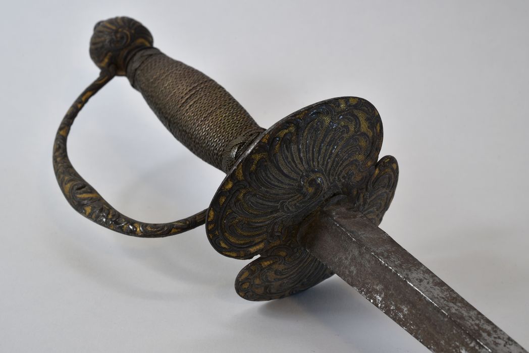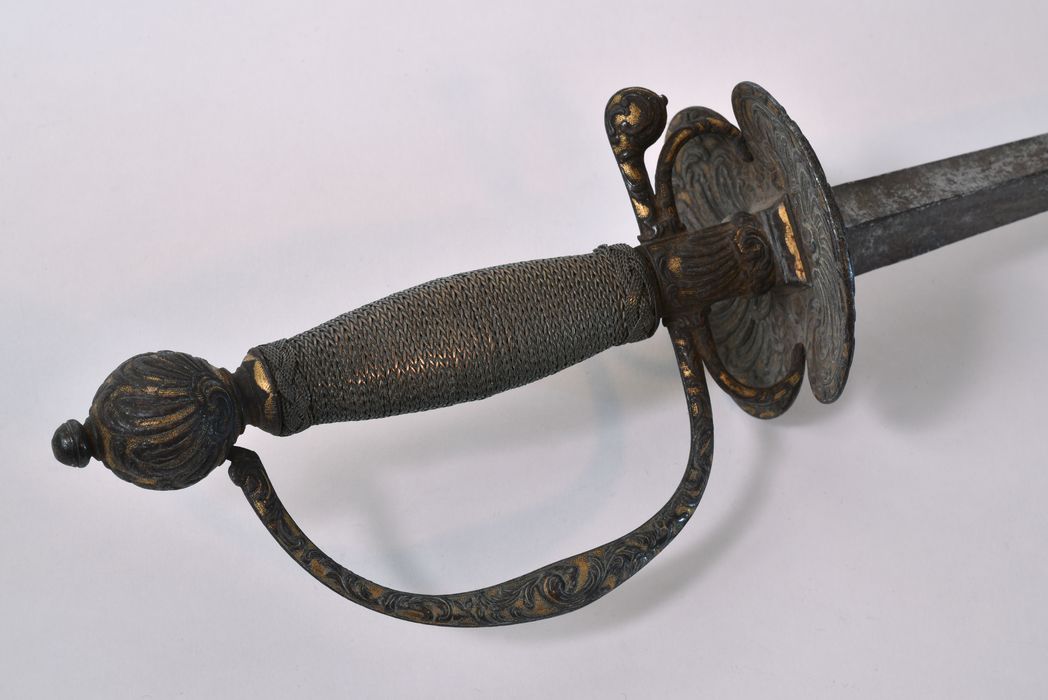 Epée en acier à lame triangulaire dont le pommeau et la coquille sont en fer ciselé. La poignée est entourée d'un filigrané de cuivre argenté.
