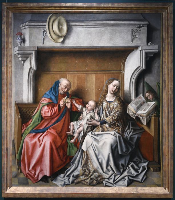 Marie tient l'Enfant Jésus sur ses genoux. Assis à côté d'elle, Joseph épluche une pomme, l'Enfant tend la main vers lui. La Vierge détourne la tête pour lire un livre tenu par un ange. la scène est située devant une cheminée à laquelle est accroché un chapeau.