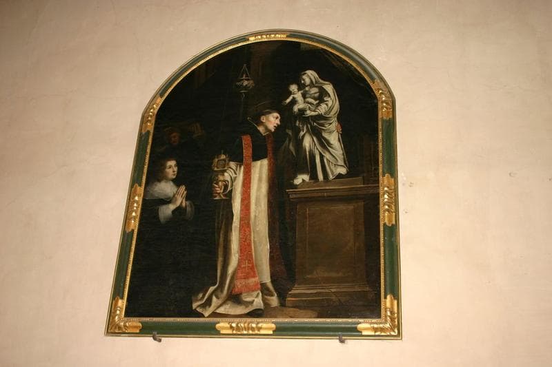 saint Hyacinthe, reliquaire, statue : Vierge à l'Enfant ; homme : en donateur ; vue d'intérieur (colonne, draperie)