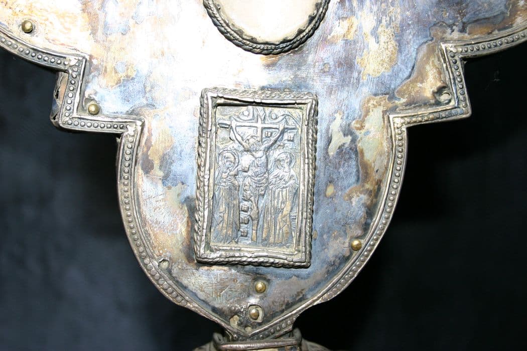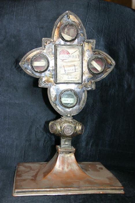 Reliquaire dont la base est en cuivre argenté. La tige présente un noeud orné de cabochons. La monstrance est quadrilobée, dans chaque lobe un cabochon de verre rond permet de voir les reliques. Au centre, se trouve un petit cadre de verre rectangulaire.