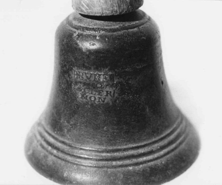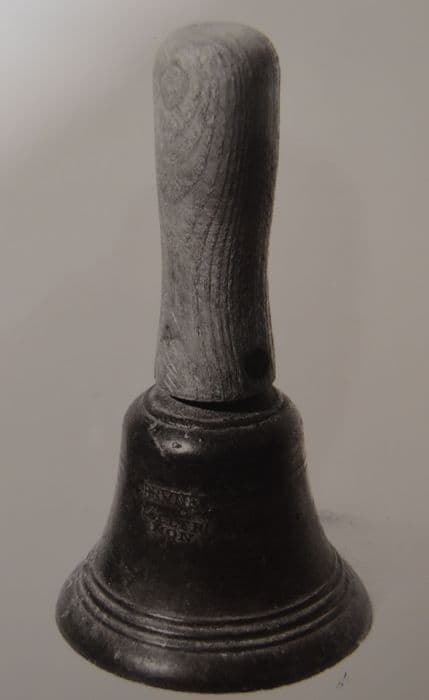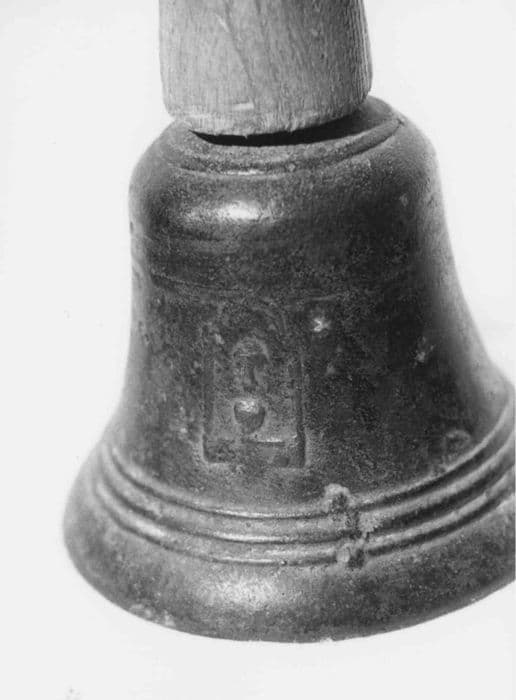 La clochette est en bronze et le manche est en bois. L'assemblage entre les les deux est maintenu par une vis.