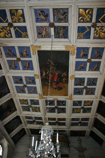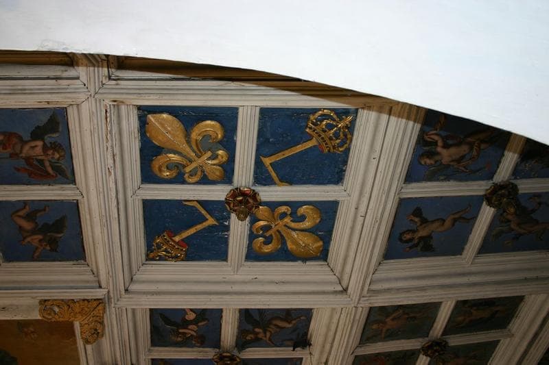 Plafond à caissons ornés d'angelots se détachant sur un fond bleu.