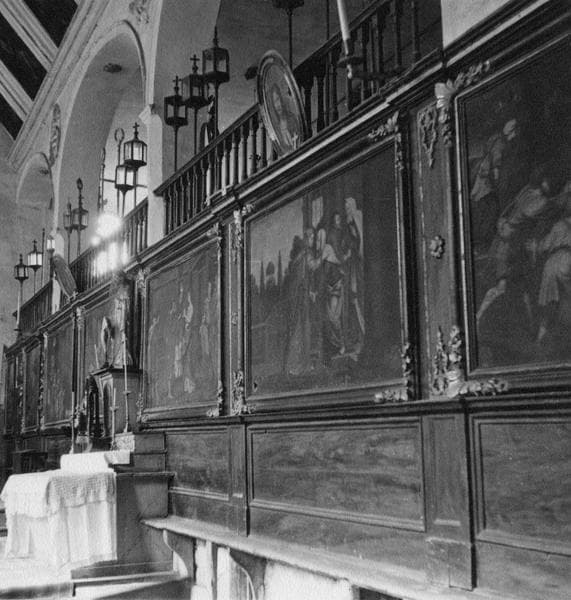 Lambris dans lesquels sont encastrés des tableaux.