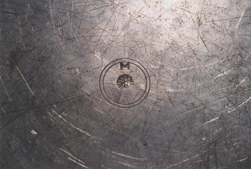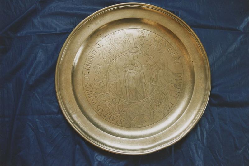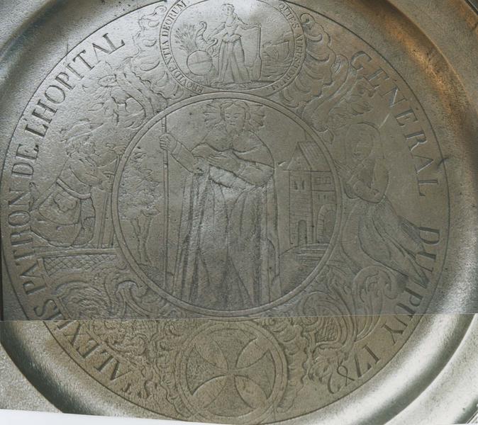 Armoiries et poinçon (plat n°2) : porte en son centre une sorte de blason surmonté d'un casque guerrier avec au milieu une fleur de lys entourée de 3 ronds et une abeille. Poinçon (plat n°2 au dos du plat). Inscription et date (plat n°3) : effigie de saint Alexis accompagné de l'inscription 'Saint Alexis patron de l'hôpital général du Puy 1782', en haut 'Providentia deorum quies augustorum'.