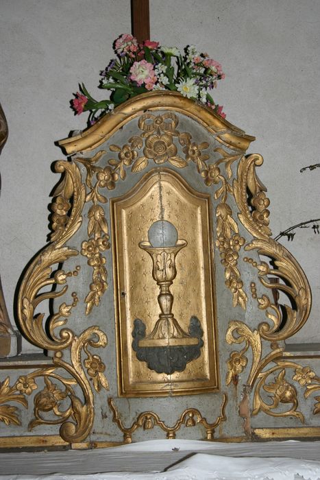 L'autel rectangulaire est décoré sur le devant d'un coeur enflammé, encadré par deux cartouches offrant un motif de semis. Les bordures sont décorées de rinceaux, de guirlandes, de fleurs et de cornes d'abondance. Sur la porte du tabernacle sont sculptés un calice et une hostie.