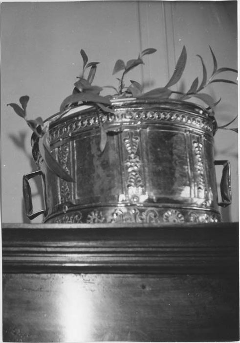 Motifs végétaux au repoussé organisés en bandes verticales sur la panse et en frise dans la partie inférieure du récipient. Frise d'oves le long du bord supérieur.