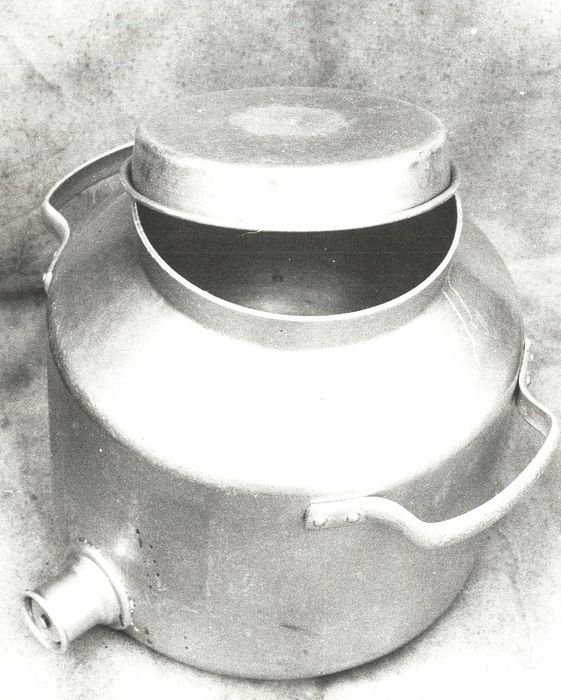 Bidon en métal présentant un couvercle et deux anses horizontales. Des tétines en caoutchouc étaient fixées au goulot.