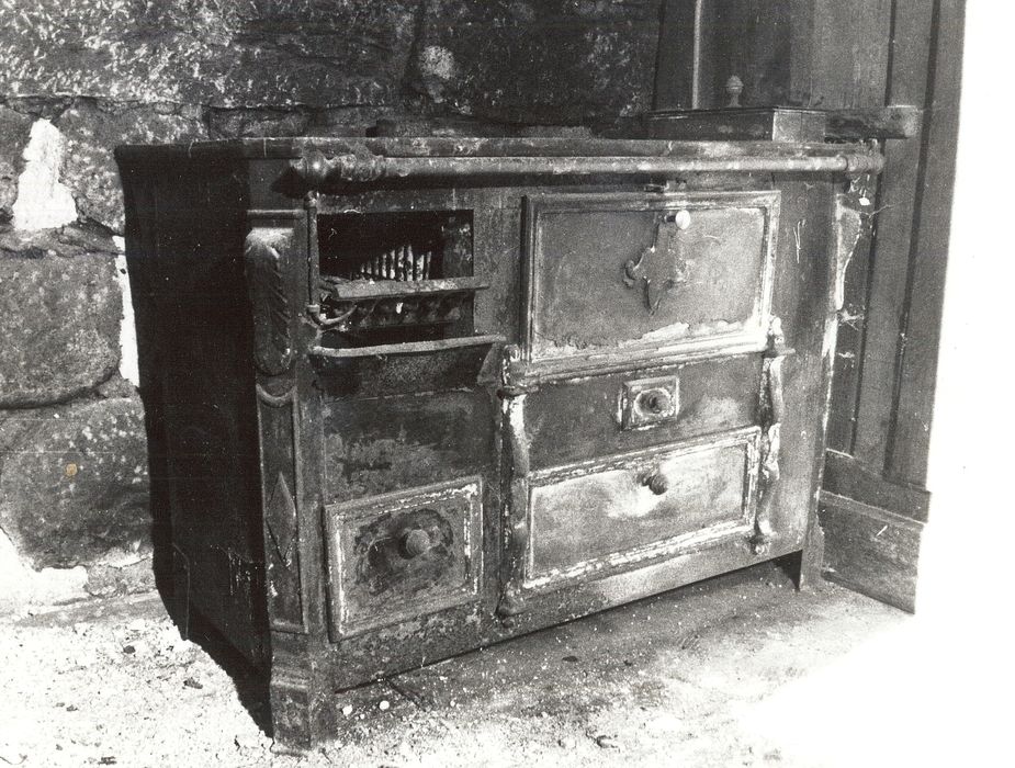 Fourneau en fonte avec bouilloire, et barre de cuivre sur le devant.