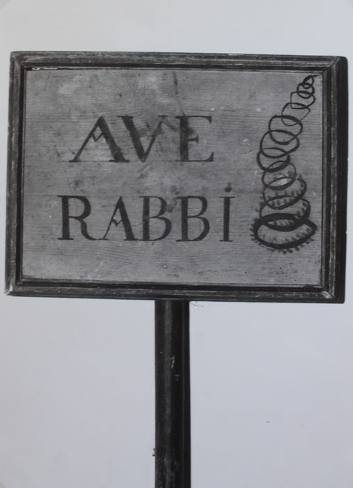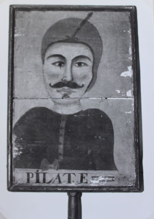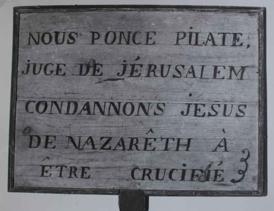 Inscriptions : Judas peccavit, Ave Rabbi, Amice ad quid venisti, nous Ponce Pilate juge de Jérusalem, Passio Domini Iesu Christi, osculto trades filium ominis, INRI.
