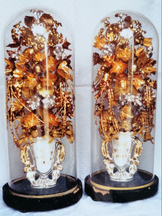 Vases en porcelaine et bois, verre, clinquant, passementerie et perles ; globe de verre.
