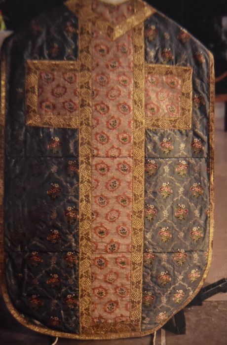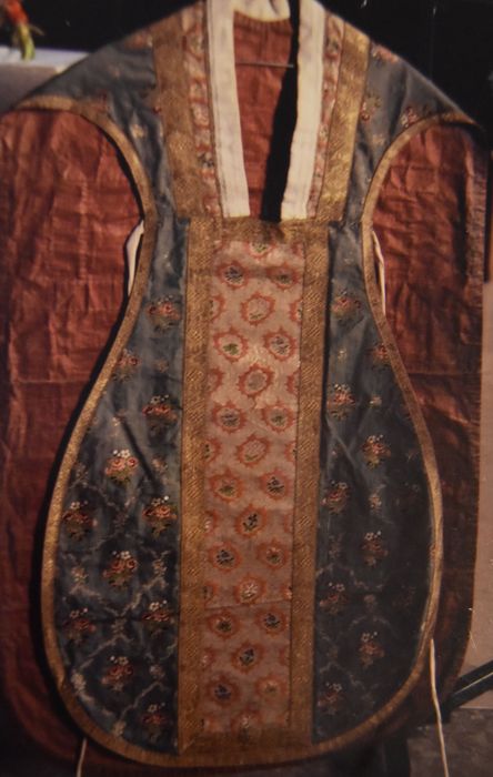 chasuble : h = 111, la = 67,5 (dos) ; chasuble : h = 108, la = 56 (devant) ; voile de calice : la = 50
