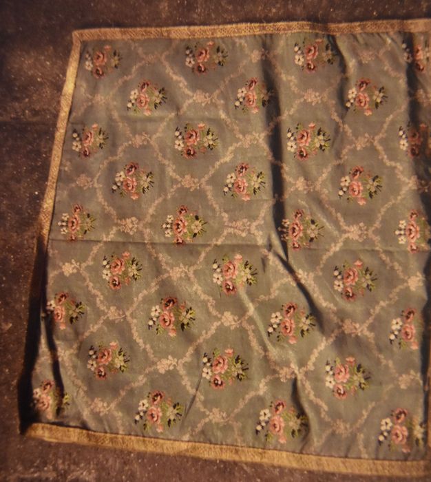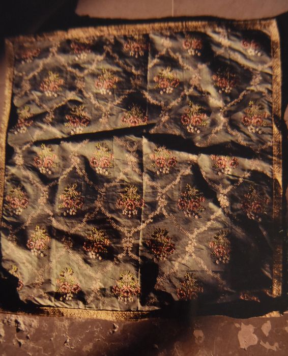 soie : brodé ; fil métal (or) ; dentelle ; lin