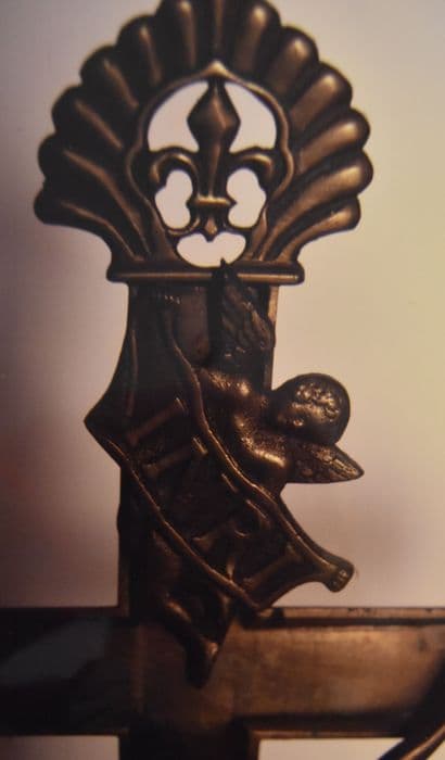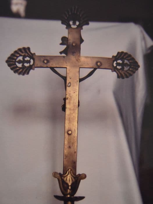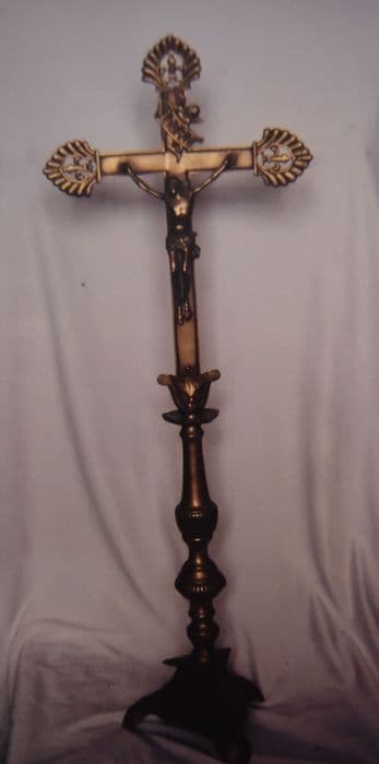 Croix en bronze fondu, découpé et ciselé, sur pied triangulaire.