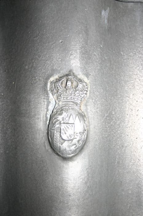 Fontaine-lavabo en étain avec cuve à deux anses et dossier.