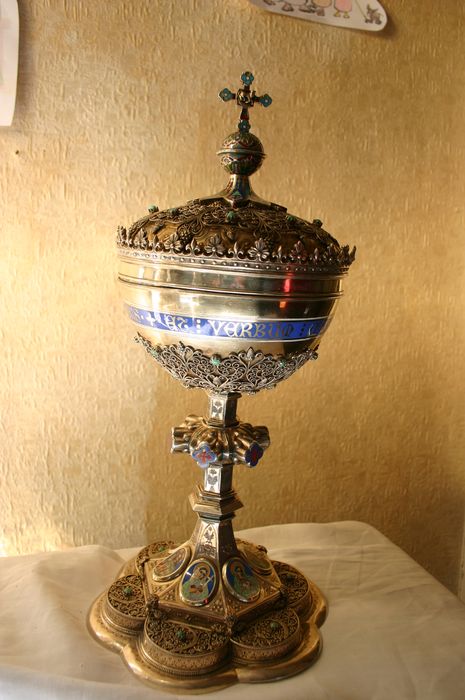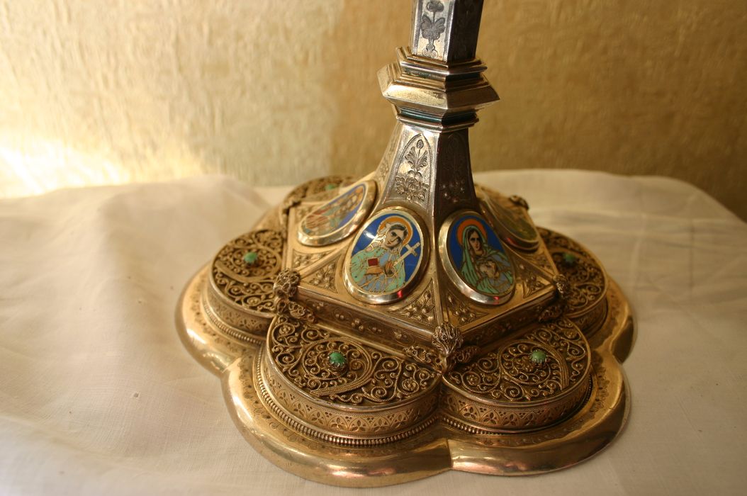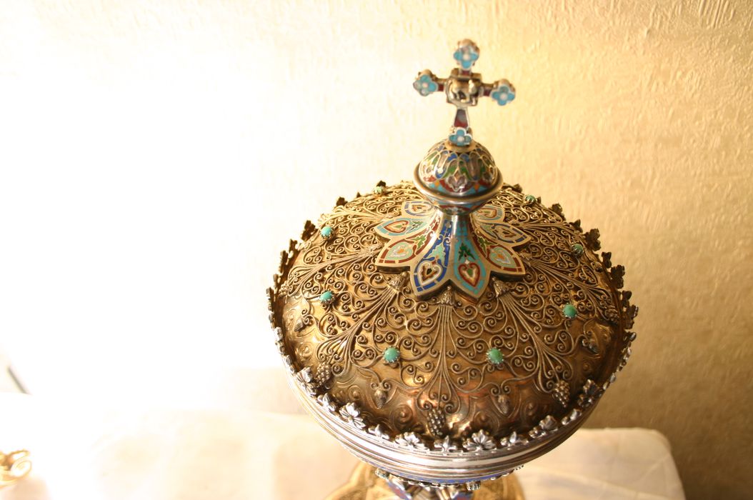 Ciboire en argent fondu, ciselé, repoussé, repercé, filigrané et doré avec émail peint et turquoises.