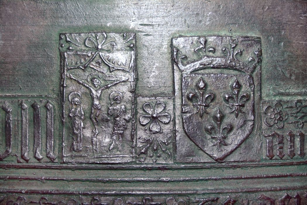 Inscription latine sur trois lignes en minuscules gothiques sur fond orné, invoquant la protection de Saint Amant contre la foudre, le gel et la tempête. Entre les lignes : quatre cartouches gothiques de grand format : une Crucifixion et un blason aux fleurs de lys ; de l’autre côté une Sainte Barbe et une autre sainte martyre. Plus bas sur la robe un cartouche isolé représente une Vierge de Pitié.
