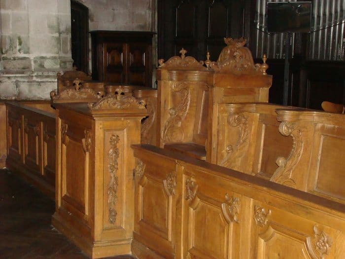 Les panneaux supérieurs coupés à mi-hauteur forment maintenant lambris du collatéral du choeur. Stalles restaurées en 1988 par Christian Karoutzos (Arts et Bâtiment).