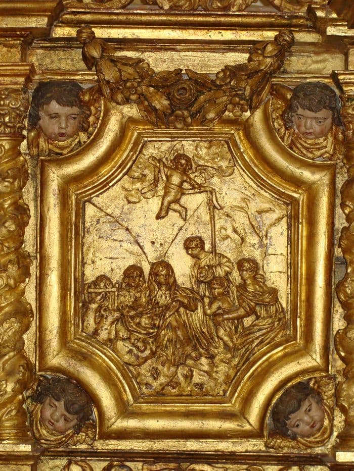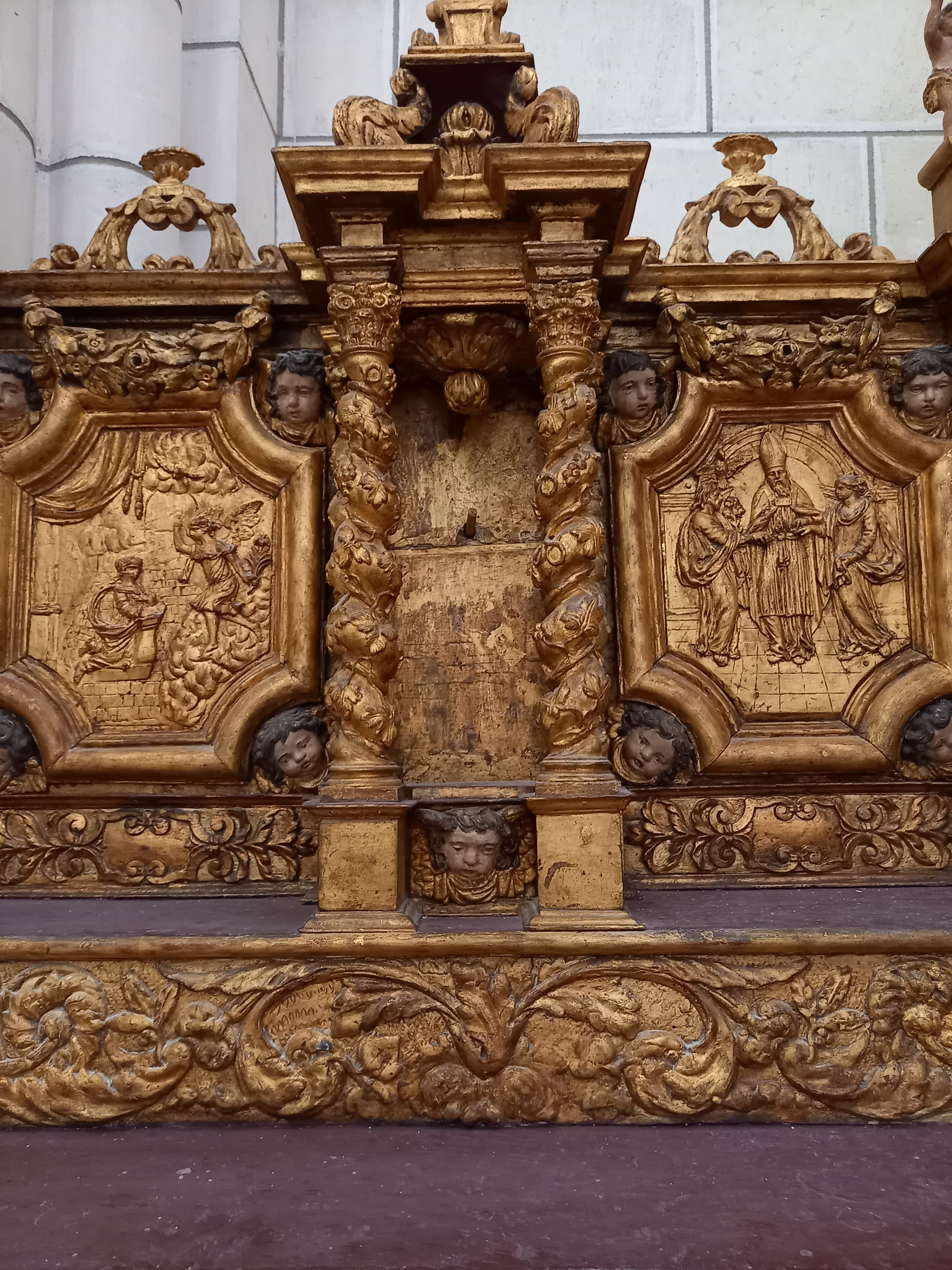 4 bas-reliefs : le Mariage de la Vierge, l'Annonciation, l'Adoration des bergers, l'Adoration des Mages