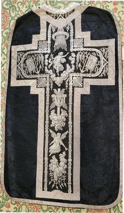 Chasuble en damas noir à l'orfroi broché de soie blanche et lamé d'argent.