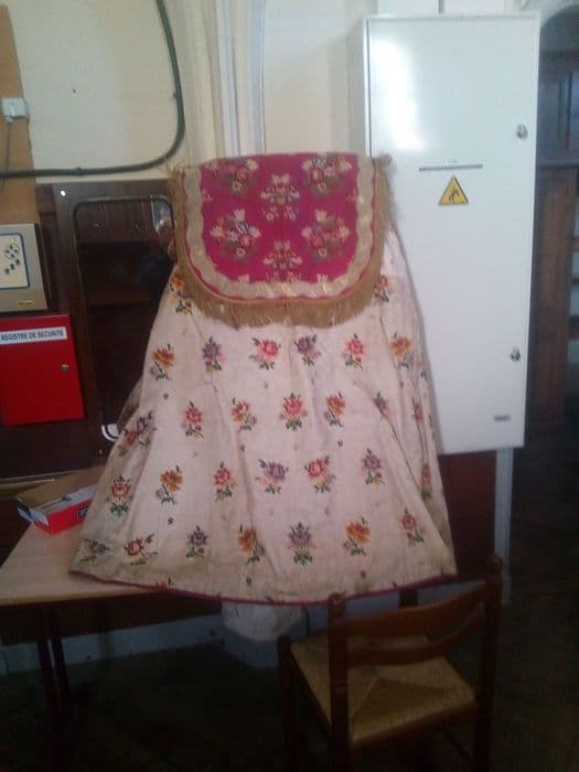 Chape en damas blanc et rouge brochés de fleurs polychromes.
