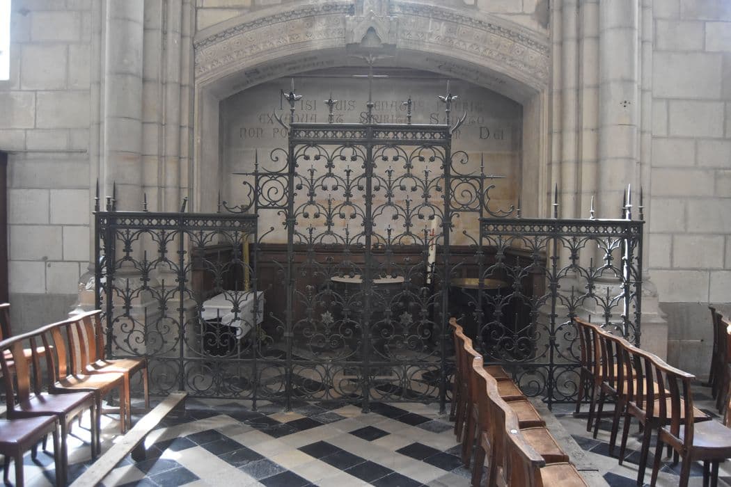 Fonts baptismaux en pierre et leur clôture en fer forgé.