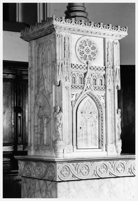 Tabernacle prenant la forme d'un beffroi ou d'une tour de cathédrale, avec une porte en arc brisé surmontée d'un pinacle lui-même surmonté d'une rosace, comportant des stautettes aux angles.