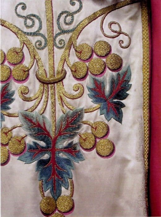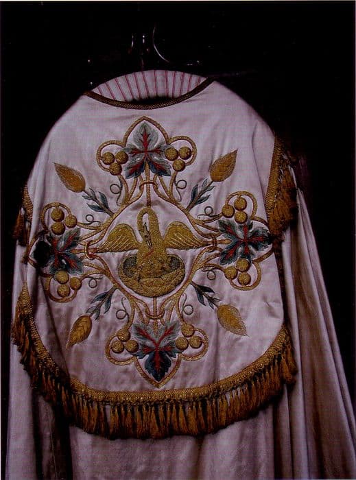 Chape blanche : satin brodé d'or, soies polychromes à motifs, dont motifs de blés et de vignes, un pélican sur le chaperon.