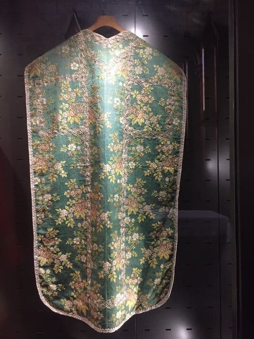 Ornement vert constitué d'une chasuble, d'une étole, d'un voile et d'une bourse de corporal.