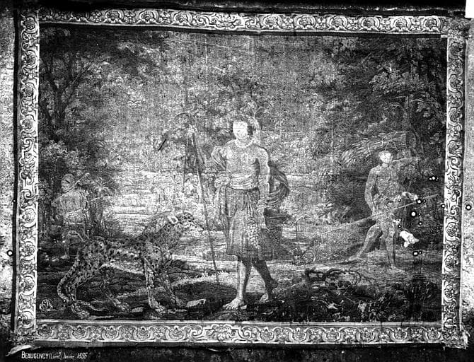 Sacrifice gaulois (45w01622) : Tableau allégorique représentant un sacrifice gaulois: Un druide, armé d'un faucille d'or, tranche le gui sacré du chêne que des enfants couronnés reçoivent sur une étoffe de lin, pendant que les sacrificateurs maintiennent au pied de l'autel les bœufs qui vont être immolés.