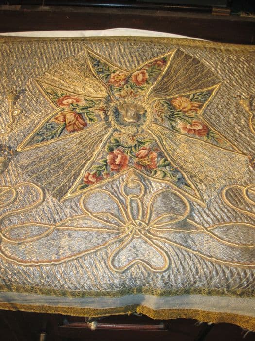 Au milieu est une croix de Malte, entourée de broderies représentant la Vierge, brodée en or et argent sur fond azur, au-dessus de laquelle est un coeur d'or suspendu à une cordelière, de chaque côté, des médaillons brodés en or sur fond argent, accompagnés d'une cordelière : celui de droite porte les le ttres S.P.E (Saint Pierre Ensentelée), celui de gauche les le ttres S.M. (Sainte Marie).