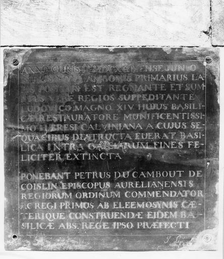 Dédicace gravée : ANNO CHRISTI MDCXC MENSE JUNIO / ISTIUS NOVI AMBONIS PRIMARIUS LA / PIS POSITUS EST REGNANTE ET SUM- / PTUS VERE REGIOS SUPPEDITANTE / LUDOVICO MAGNO XIV HUJUS BASILI- / CAE RESTORATORE MUNIFICENTISSI- / MO HAEREST CALVINIANA A CUJUS SE- / QUACIBUS DESTRUCTA FUERAT BASI- / LICA INTRA GALLIARUM FINES FELICITER EXTINCTA / PONEBANT PETRUS DU CAMBUT DE / COISLIN EPISCOPUS AURELIANENSIS / REGIORUM ORDINUM COMMENDATOR / AC REGI PRIMUS AB ELEMOSYNIS CAE- / TERIQUE CONSTRUENDAE EIDEM BA- / SILICAE AB REGE IPSO PRAEFECTI. J. Leve Sculpsit.