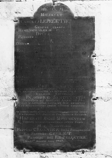 Libellé de l'arrêté de classement : Epitaphe de Carolus Lepelletier, cuivre gravé, 1787.
