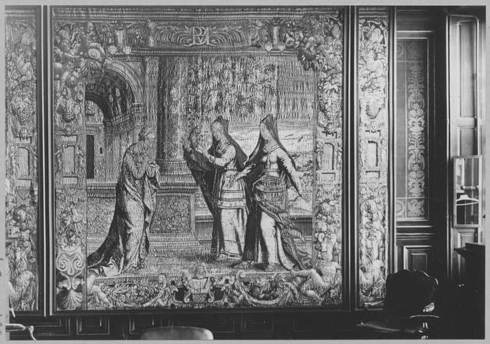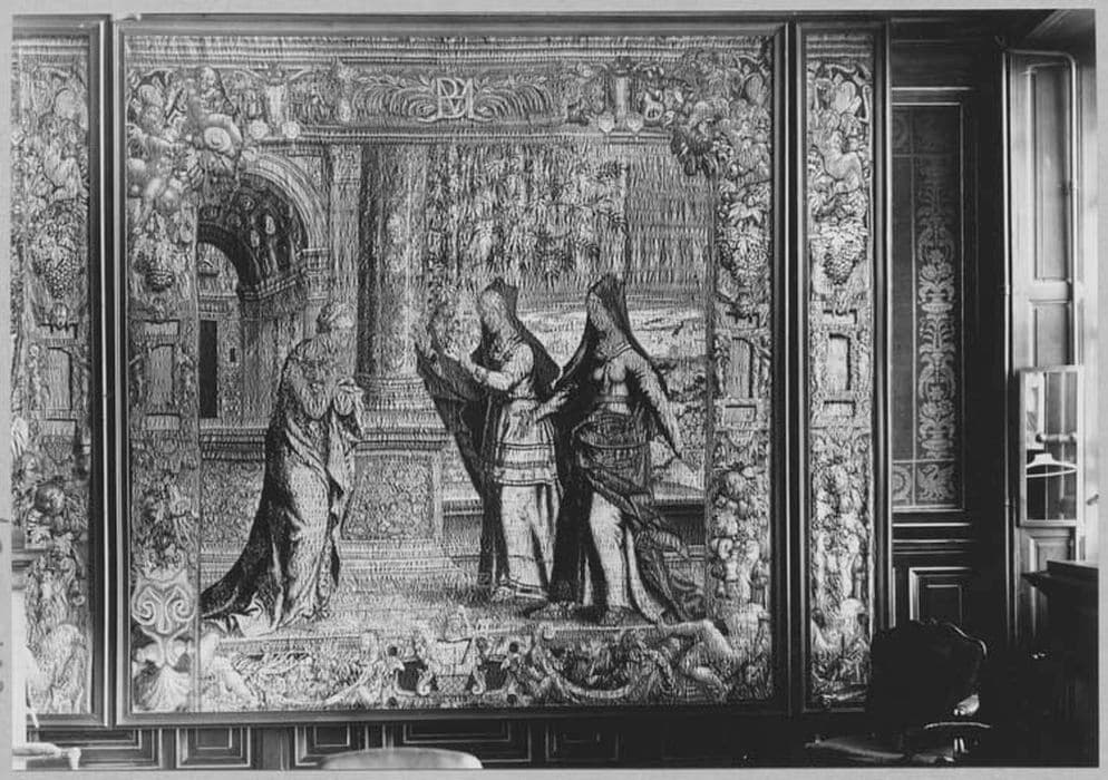 h = 275 ; la = 178 ; Dimensions de la 1ère tapisserie ; 2e tapisserie : h = 275, la = 400 x 159 ; 3e tapisserie : h = 275, la = 372 ; 4e tapisserie : h = 317, la = 304