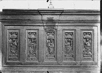 Cinq panneaux encastrés dans le banc d'oeuvre.