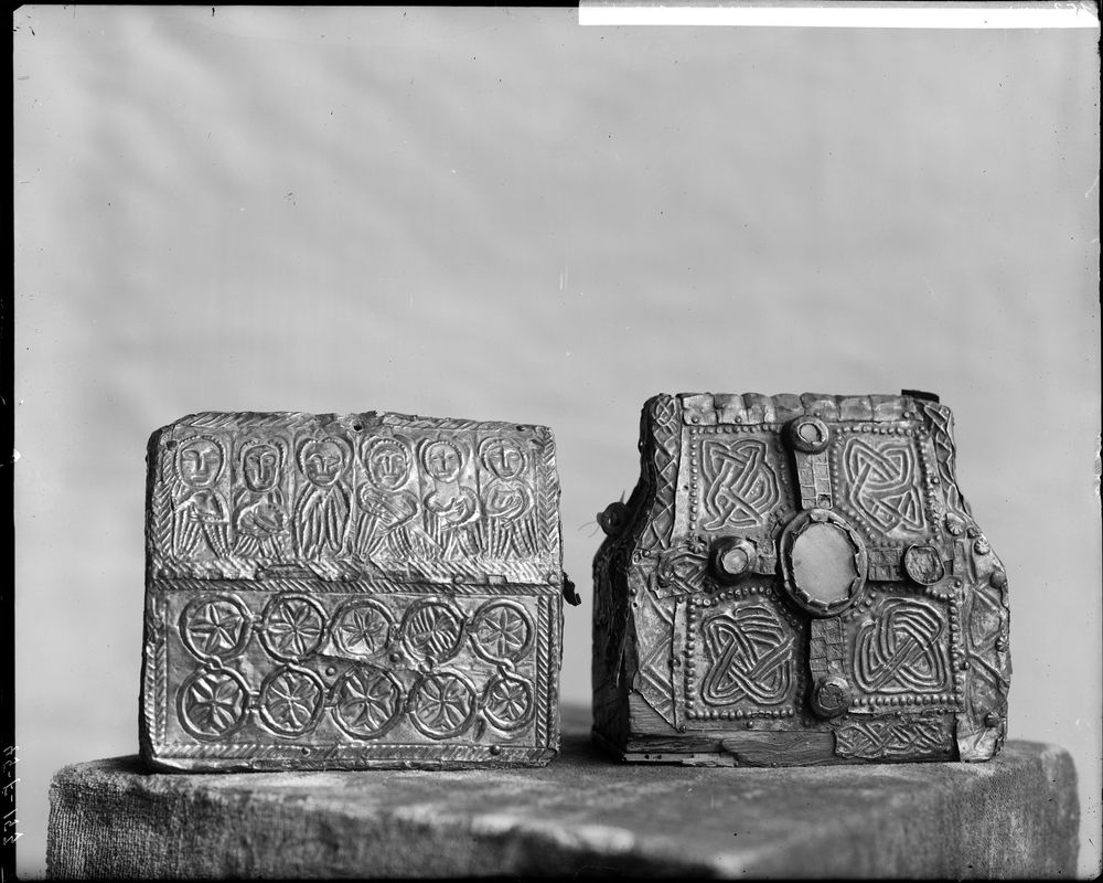 Petite châsse en forme de coin. Ame de bois revêtue de plaques de cuivre repoussé.