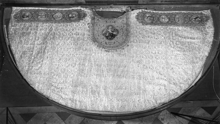 Soie brochée de fils d'argent doré dessinant des méandres enserrant des croix grecques. La chape est ornée sur les parements de médaillons figurant les premiers évêques d'Orléans : saint Aignan, saint Mamert, saint Charles, saint Maximin et saint Euverte.