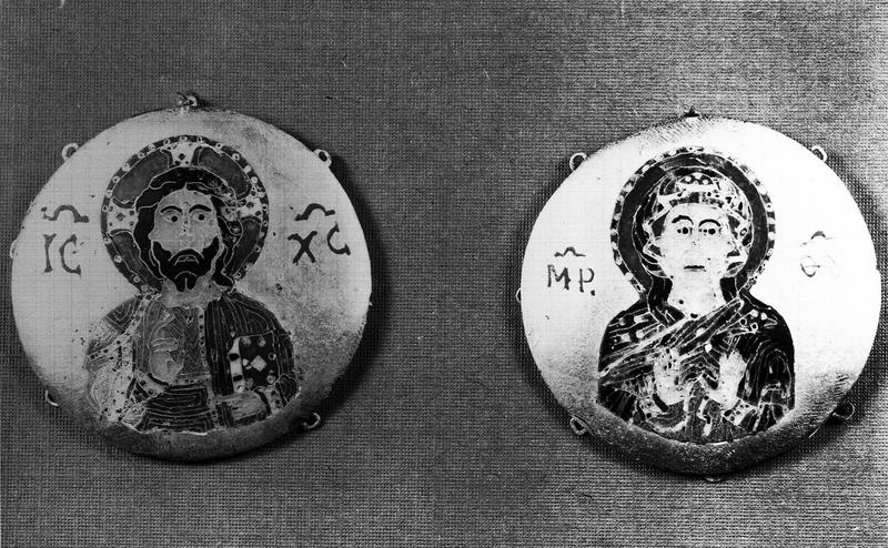 Deux boucles de ceinture en bronze, anneau de bronze avec pierre non identifiée, vestiges de vêtements liturgiques, noeud de calice en étain, médaillons de gants consistant en disques d'or décorés d'émaux cloisonnés art Byzantin 11e siècle, plaque de plomb avec inscription donnant le nom de l'évêque et la date de son décès.