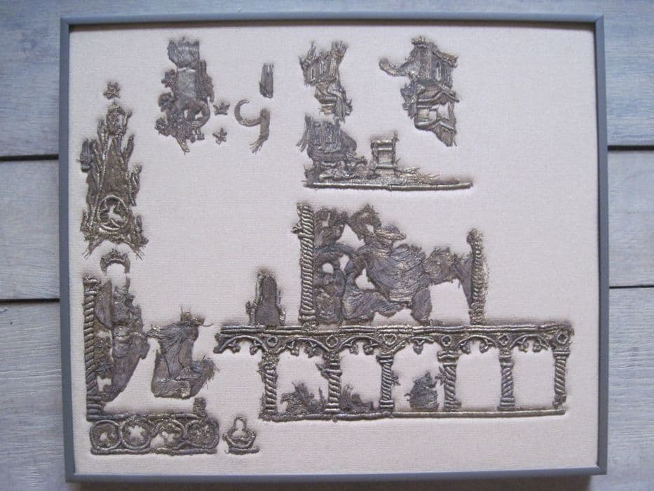 Sans datation. Provenant d'une sépulture anonyme découverte en 1937 : vestiges d'une mitre du 15e siècle trouvés dans le terre plein du sanctuaire devant l'autel auprès d'ossements anonymes.