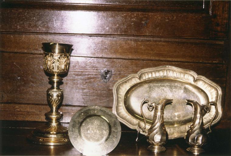 Oeuvre d'un très bon orfèvre parisien Tonnelier, en 1762, cette chapelle comporte un calice, une patène plus ancienne de Lécuyer (sa veuve avait épousé Tonnelier), un plateau et des burettes en argent doré. Le style rocaille domine à travers ces pièces : décor de côtes torses et vagues. Certains éléments du calice annoncent cependant déjà le style Louis XVI ainsi que les macarons du pied et le décor assez symétrique de la fausse coupe. L'ensemble des pièces porte un chiffre non identifié S.W.
